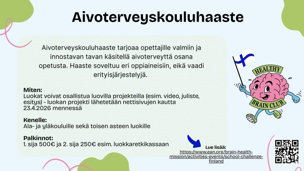Aivoterveyskouluhaaste kutsuu suomalaiset koulut mukaan innostavaan projektiin, joka on osa European Academy of Neurologyn Brain Health Mission toimintaa. Osallistuminen on opettajille helppoa ja parhaat työt palkitaan rahapalkinnoin. Haaste sopii erityisesti terveystiedon, biologian, psykologian, liikunnan ja monialaisten kokonaisuuksien yhteyteen.