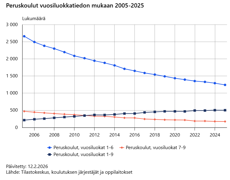 Peruskoulujen määrä jatkoi laskuaan 2025